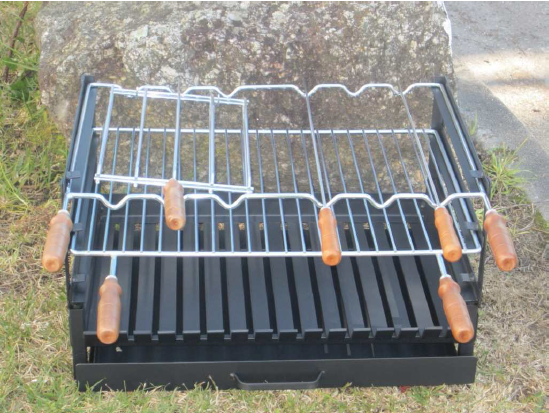 1 grelha de carne; 1 aro; 1 grelha de frango; 2 espetos redon. aço inox