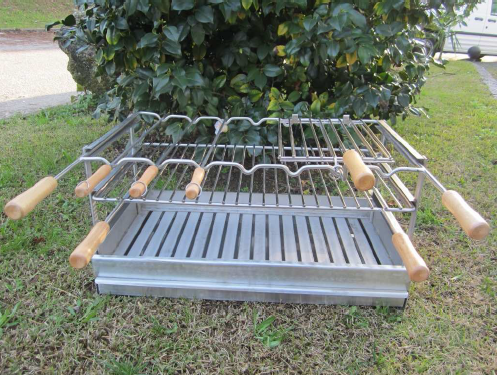 1 grelha inox de carne; 1 aro inox; 1 grelha inox de frango; 3 espetos aço inox
